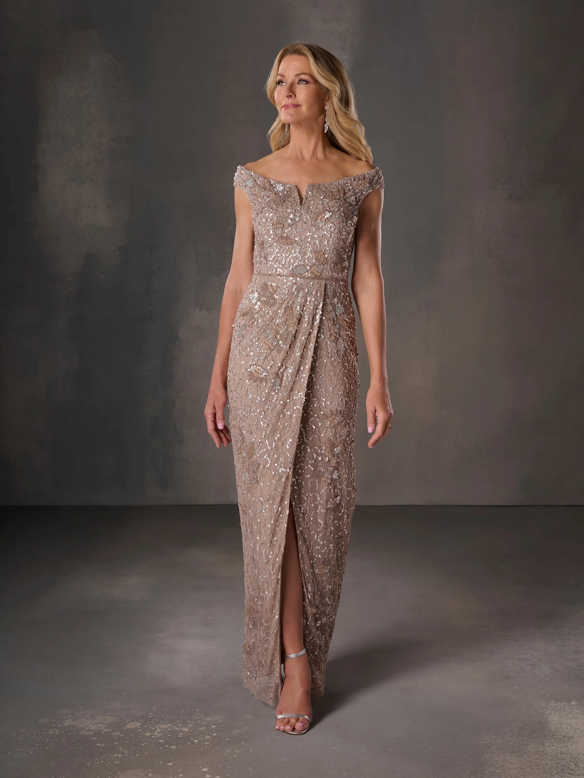 Off the shoulder all over beaded gown with draped slim skirt with slit.