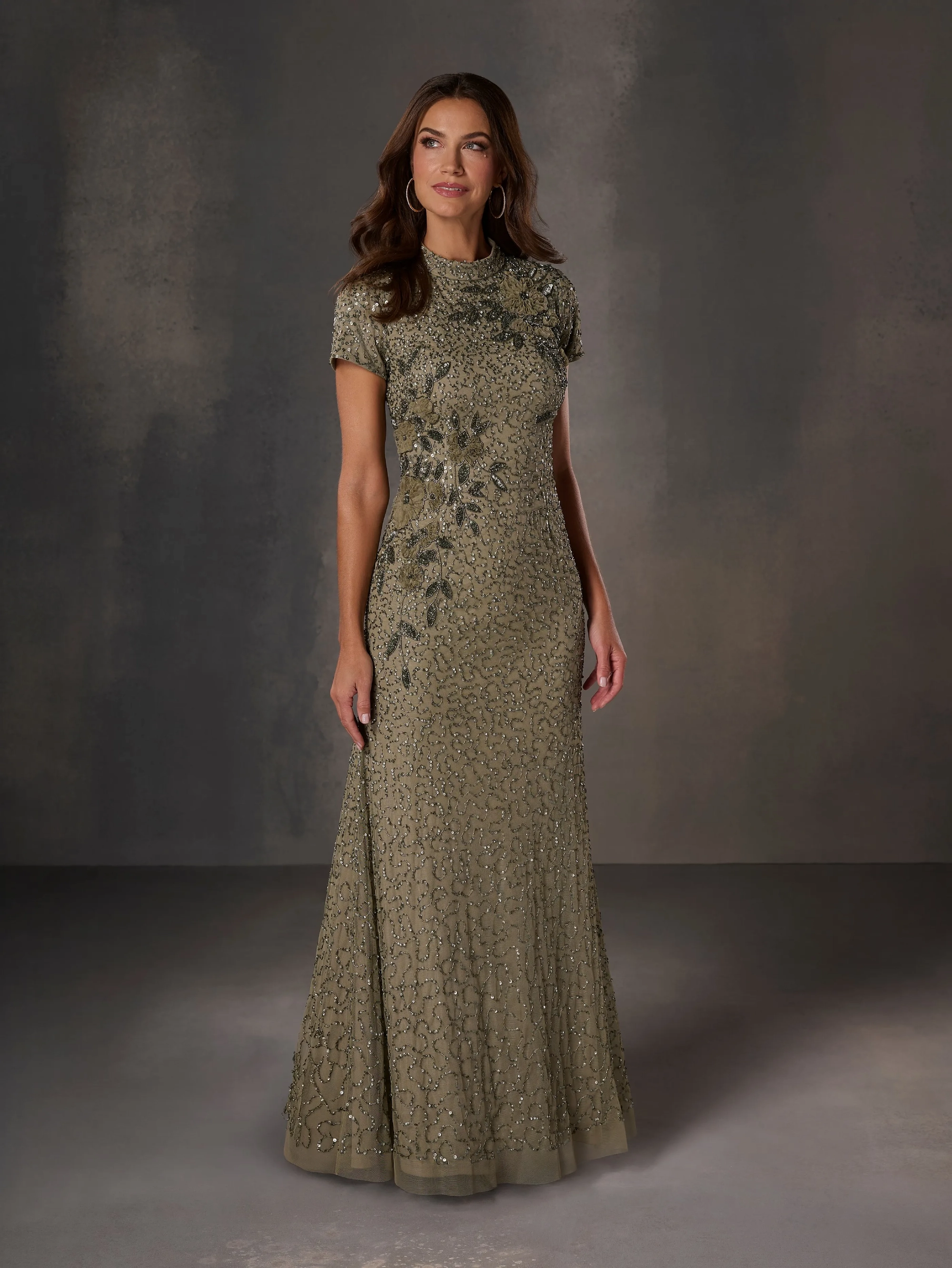 All over beaded, mock neckline slim gown with short sleeves.