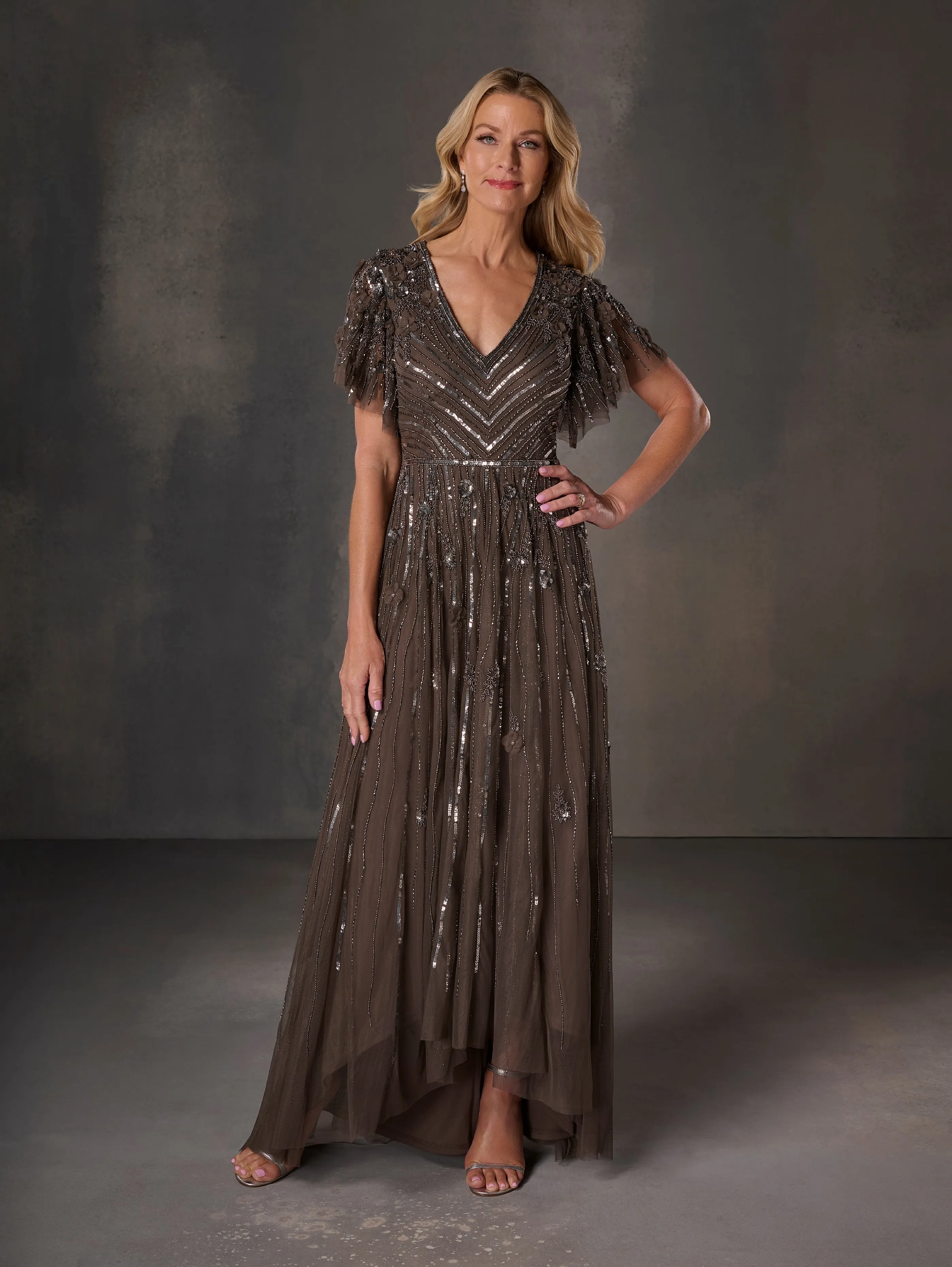 All over beaded gown with 3D flowers, flutter sleeves and high low skirt.