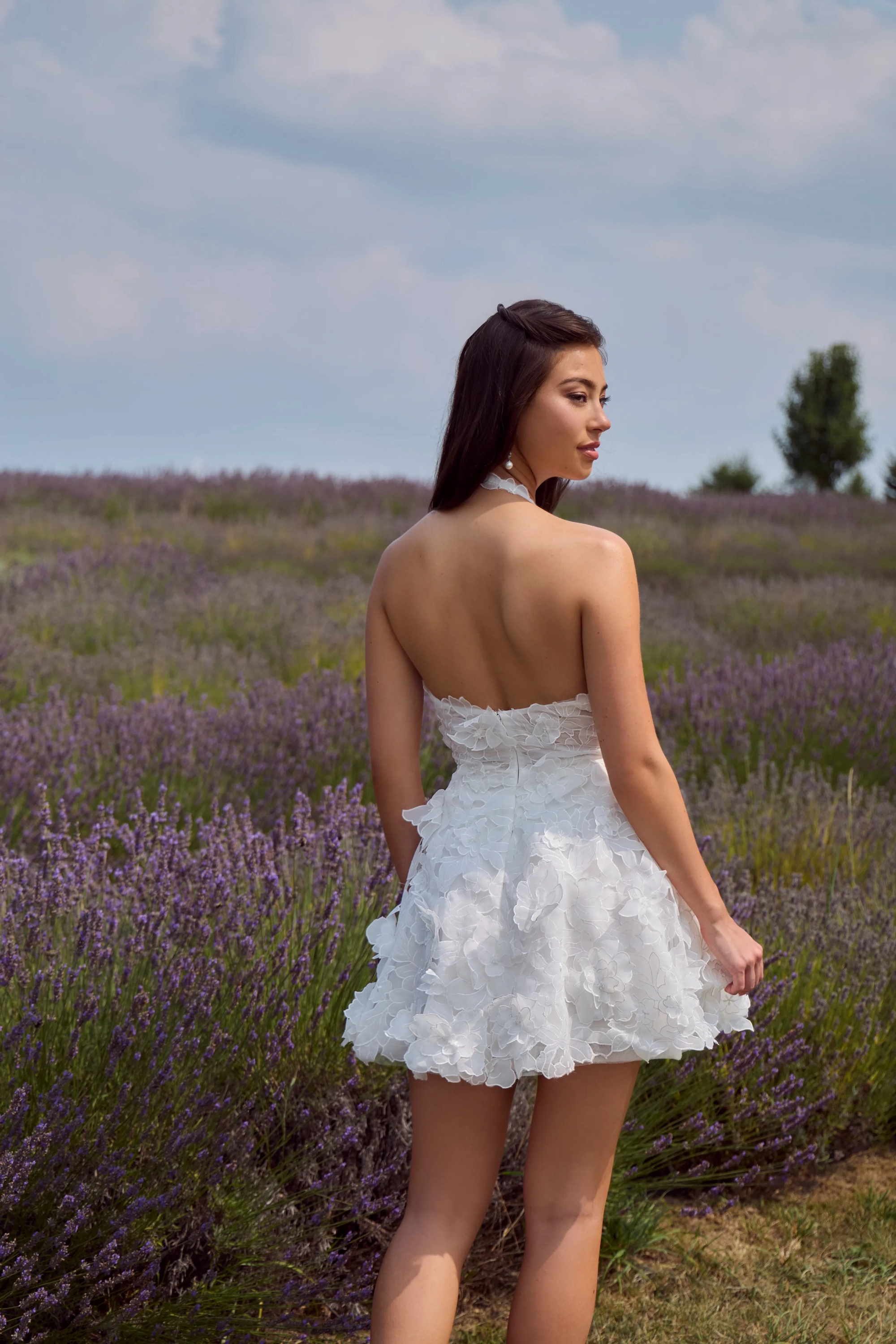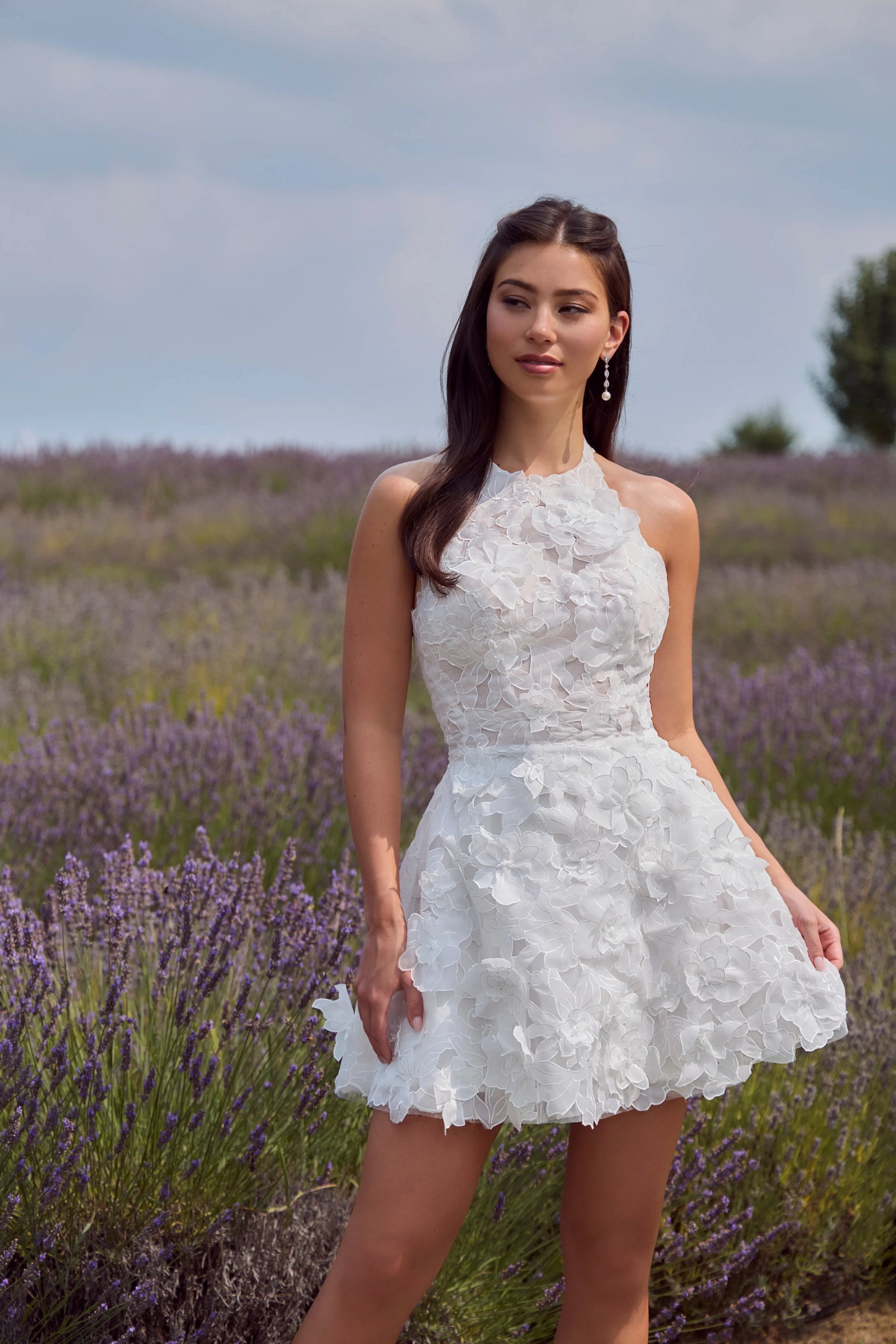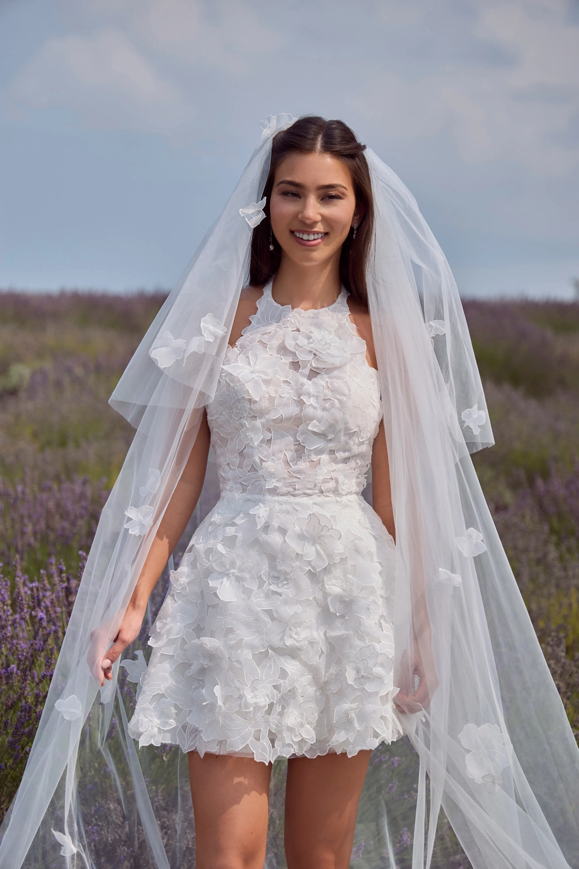 With our high-neck short wedding dress Tristanne, every petal is designed for brides who crave romance with a touch of drama. Her halter neckline balances the flirty A-line silhouette, while dimensional floral lace appliques dance across her in a way that the blooms come alive. Her matching veil (V2625C) echoes her floral motif, completing a look that feels effortlessly classic yet unforgettable. She would be perfect for a bride who wants her walk down the aisle to feel like stepping into a secret garden.